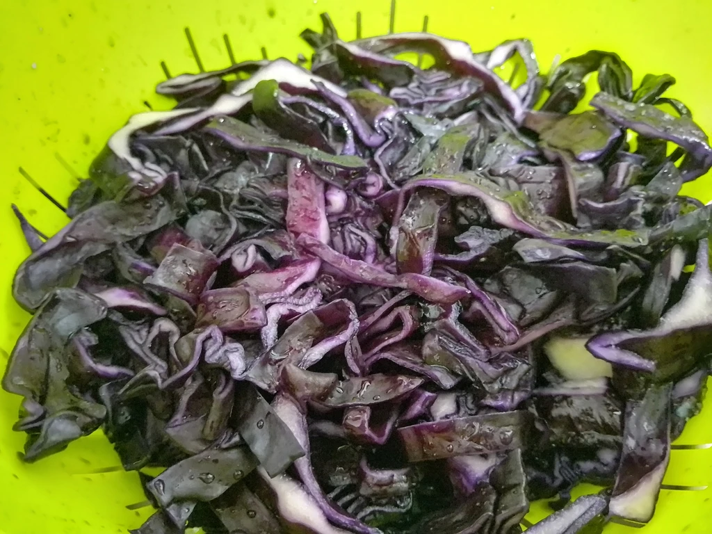 Die äußersten Blätter des Rotkohls ziehen wir ab und halbieren den Kohl. Dann schneiden wir den Strunk heraus und zerkleinern den Kohl. Entweder kann dieser in feine Streifen geschnitten werden, oder mit einer Reibe gehobelt werden. Den Rotkohl geben wir in ein Sieb und bestreuen diesen mit Salz. Das Ganze wird ordentlich vermengt und über Nacht stehen gelassen.