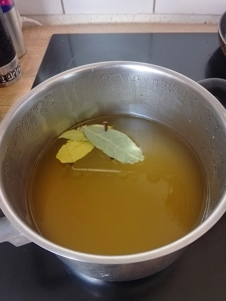Dann vermischen wir in einen Topf Wasser, dem Apfelessig und geben optional den Zucker hinzu. Zwar gibt der Zucker dem Rotkohl eine gewisse Süße, jedoch für jene die auf Industriezucker und ähnliches verzichten, können dies weglassen. Mir schmeckt es auch ohne Zucker. Zusätzlich kommen die Nelken und die Lorbeerenblätter hinzu. Verrührt das ganze und kocht die Flüssigkeit auf. Sobald der Sud kocht, stellt die Flamme herunter und lasst das ganze ziehen.