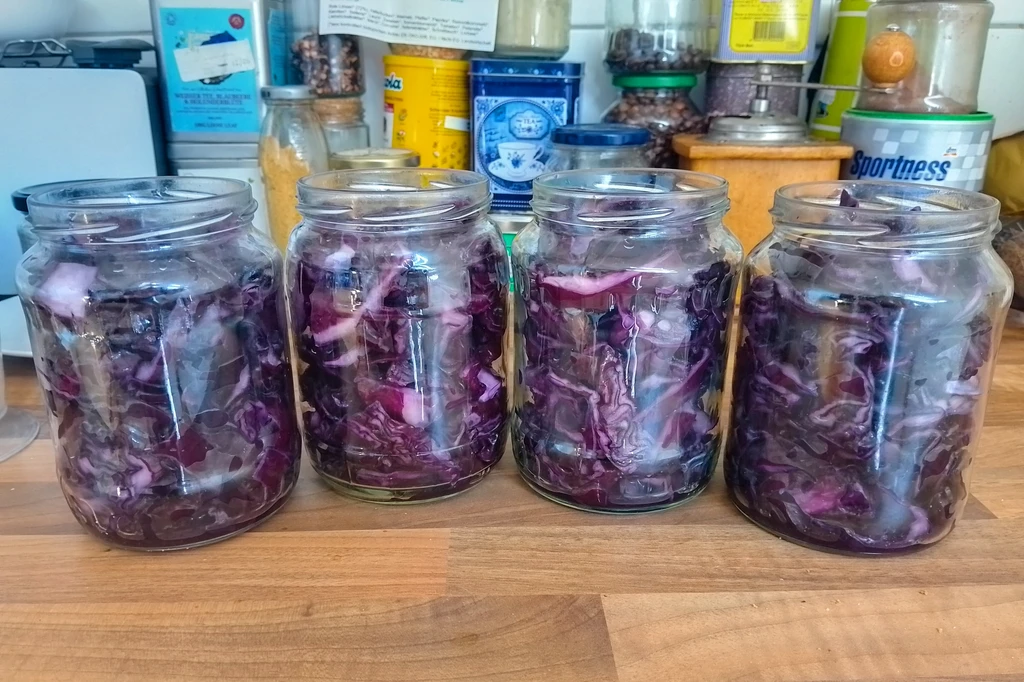 In der Zwischenzeit waschen wir den Rotkohl mit etwas Wasser ab und befüllen die Gläser damit. Diese sollen bis oben befüllt werden, drückt auch etwas nach damit der Platz optimal genutzt wird. Dann gießen wir den Sud in die Gläser, verschließen diese und stellen die auf den Kopf.